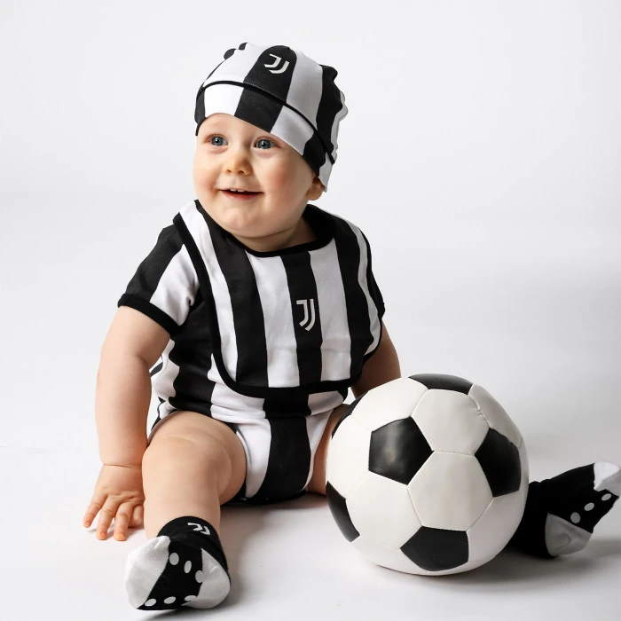 Made from 100% cotton, featuring a black-and-white striped design and the Juventus logo, making it the perfect set for little Juventus fans from birth.
