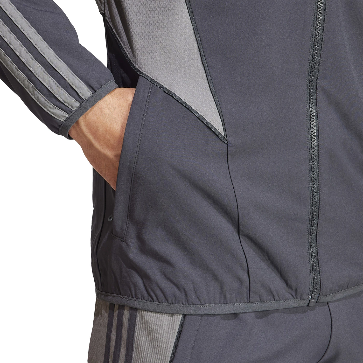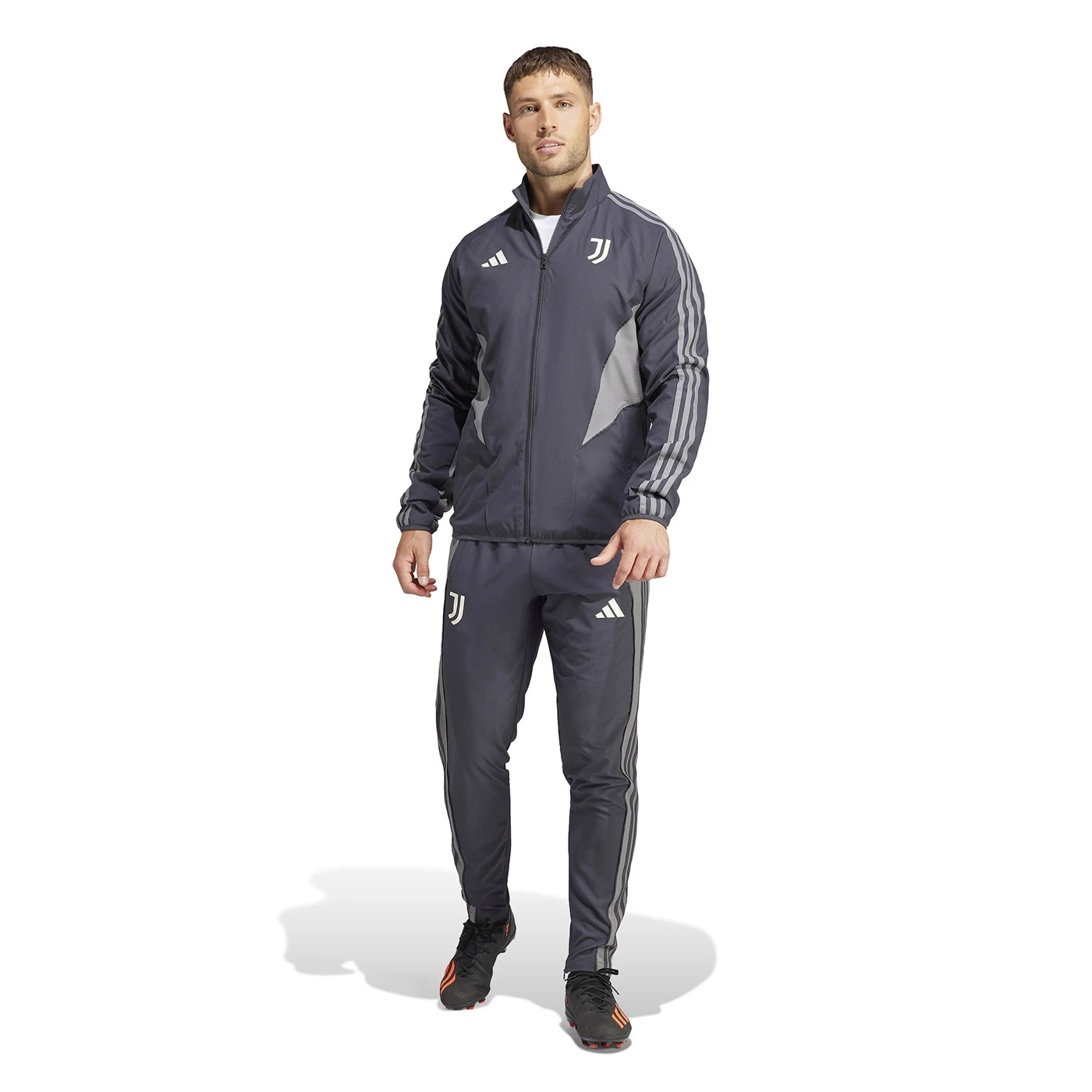Stand with the club and its city. Showing off monochromatic colours borrowed from Juventus' Turin-inspired third kit, this is the adidas football jacket players wear when they line up before the biggest games. Its mesh-lined plain weave fabric means it'll keep you comfortable while you back your team off the pitch. The slim fit and moisture-wicking AEROREADY ensure it doesn't slow you down when you head onto it. Slim fit. Full zip with stand-up collar. 100% recycled polyester. Front zip pockets. This model is 186cm tall and wears a size M.