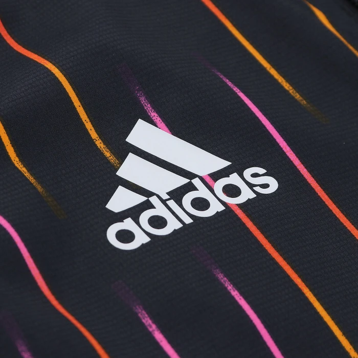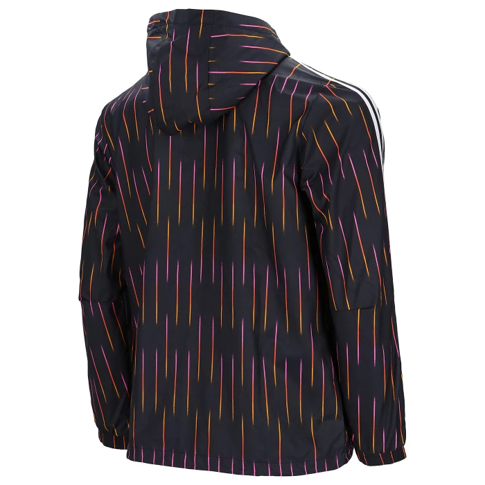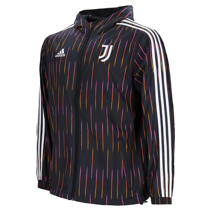 Giacca antivento a manica lunga, collo alto e cappuccio, zip intera frontale, tasche laterali. Loghi Juventus e adidas. 100% poliestere.