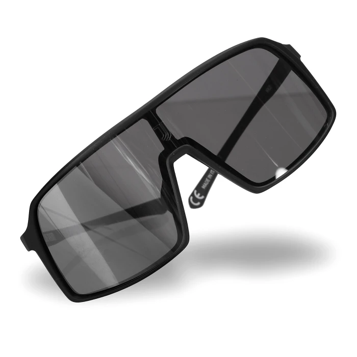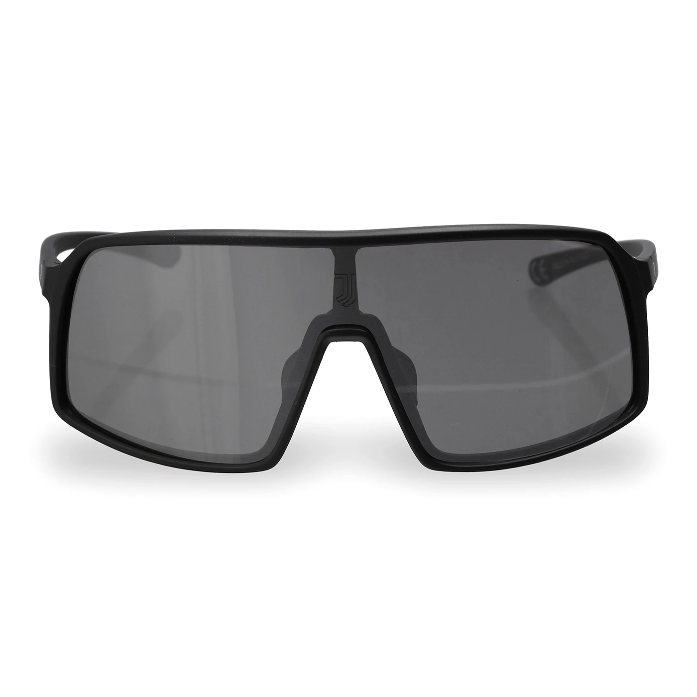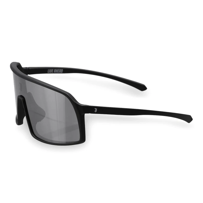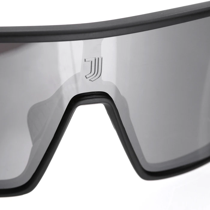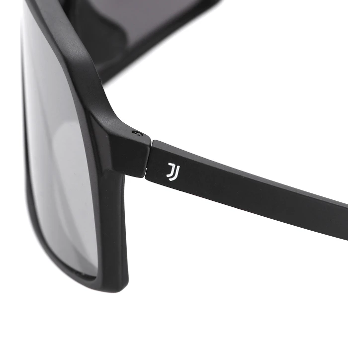 Occhiali da sole neri con logo Juventus sulle aste e contrale sulla lente. Lente specchiata e finitura opaca. Sacchetto in tessuto personalizzato di colore nero.