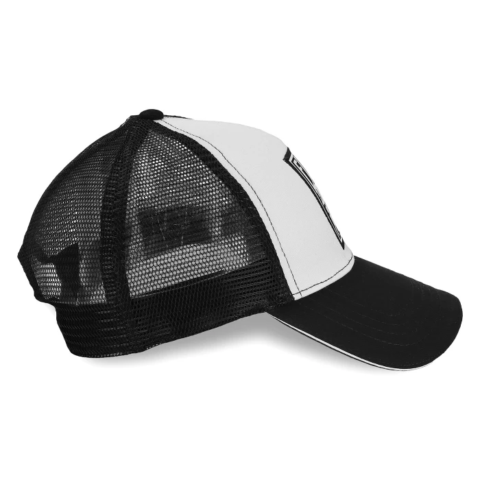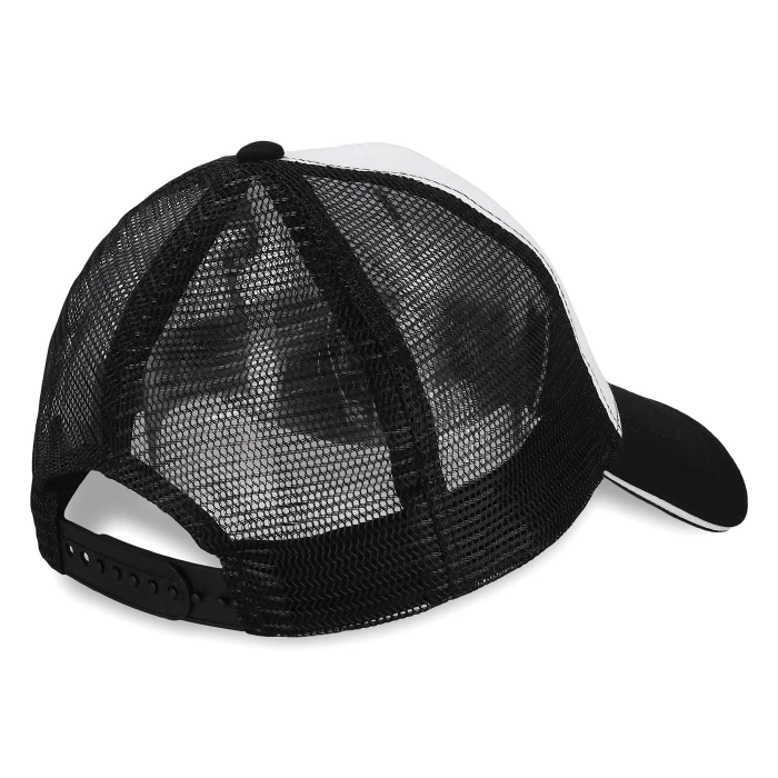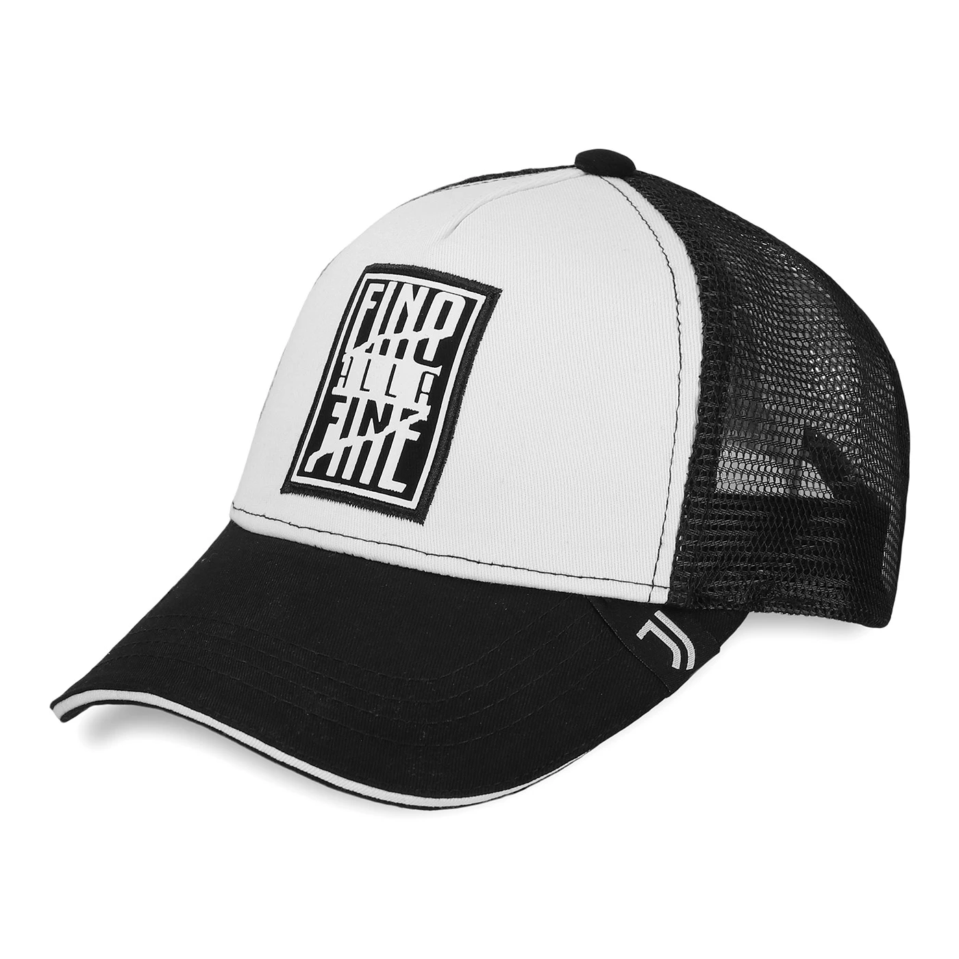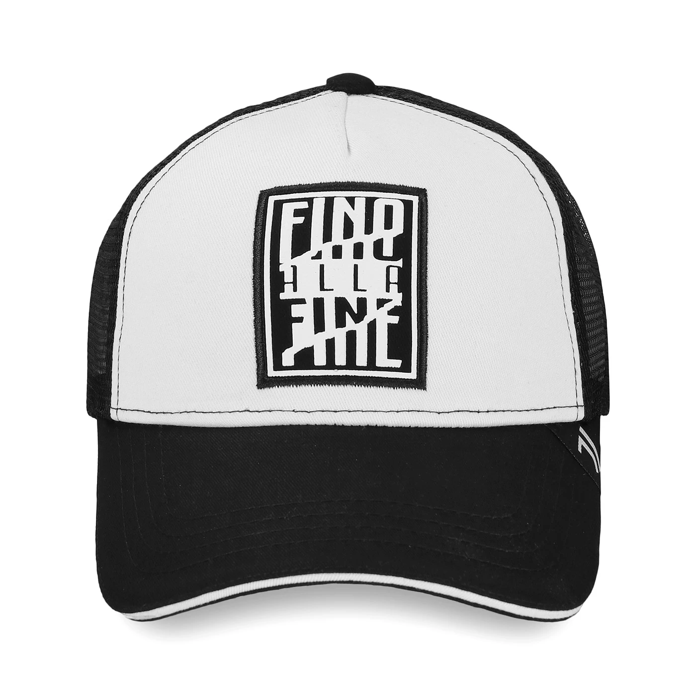 Black and white adjustable trucker cap. Fino Alla Fine inscription on front.