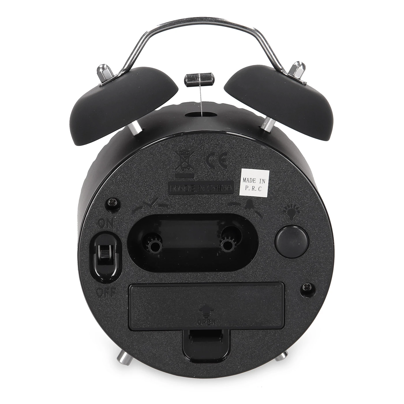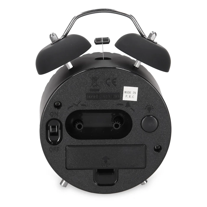 Alarm clock made of plastic with silent movement. Diameter 9 cm.